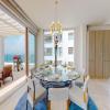 On the second level, there are two bedrooms, the living room (with 65 inch TV), dining room (with seating that can accommodate 10), fully equipped kitchen, and sun deck with a private pool.