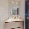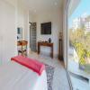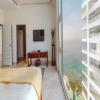The Master Bedroom suite is over1,100 sf, has a king sized bed, and offers expansive ocean and city views. It also has its own private terrace (550 sf) with two chaise lounges as well as a circular lounge. The terrace is the perfect spot from which to soak up the sun, enjoy the views, or read a good book. The suite has a small dining/game table, a separate TV viewing area (55 inch screen), and a bar with mini-refrigerator. There is also a very large walk-in closet and bath area.