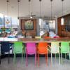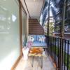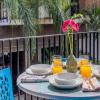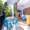 The kitchen features stainless steel appliances with a new microwave and fridge. The compact and efficient kitchen is fully equipped for snacking or a full meal preparation. There is a high top table looking out to the terrace where you can enjoy a cocktail or food indoors should you not want to be outdoors.