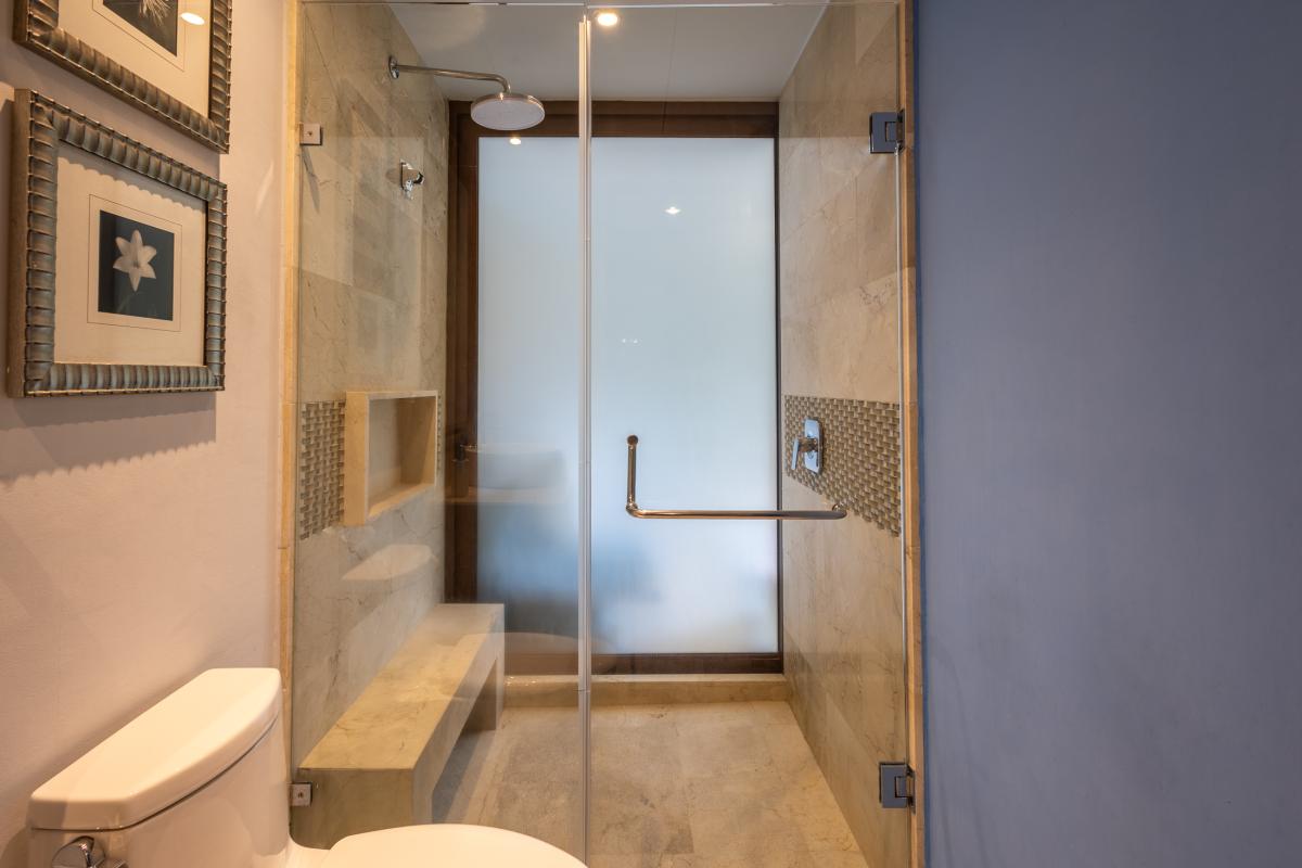 The living area adjacent to the kitchen has a beautiful sofa and ottoman looking out to the terrace where you can lounge with your feet up and a glass of wine in hand. Separating the living area from the bed is a custom shelving unit with built in dresser drawers providing a clear separation to the two spaces. The King bed is exceptionally comfortable and affords you a view to the Terrace.